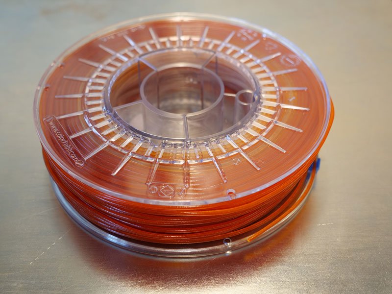 A green-yellow tinted spool of recycled filament by Uģis Albiņš